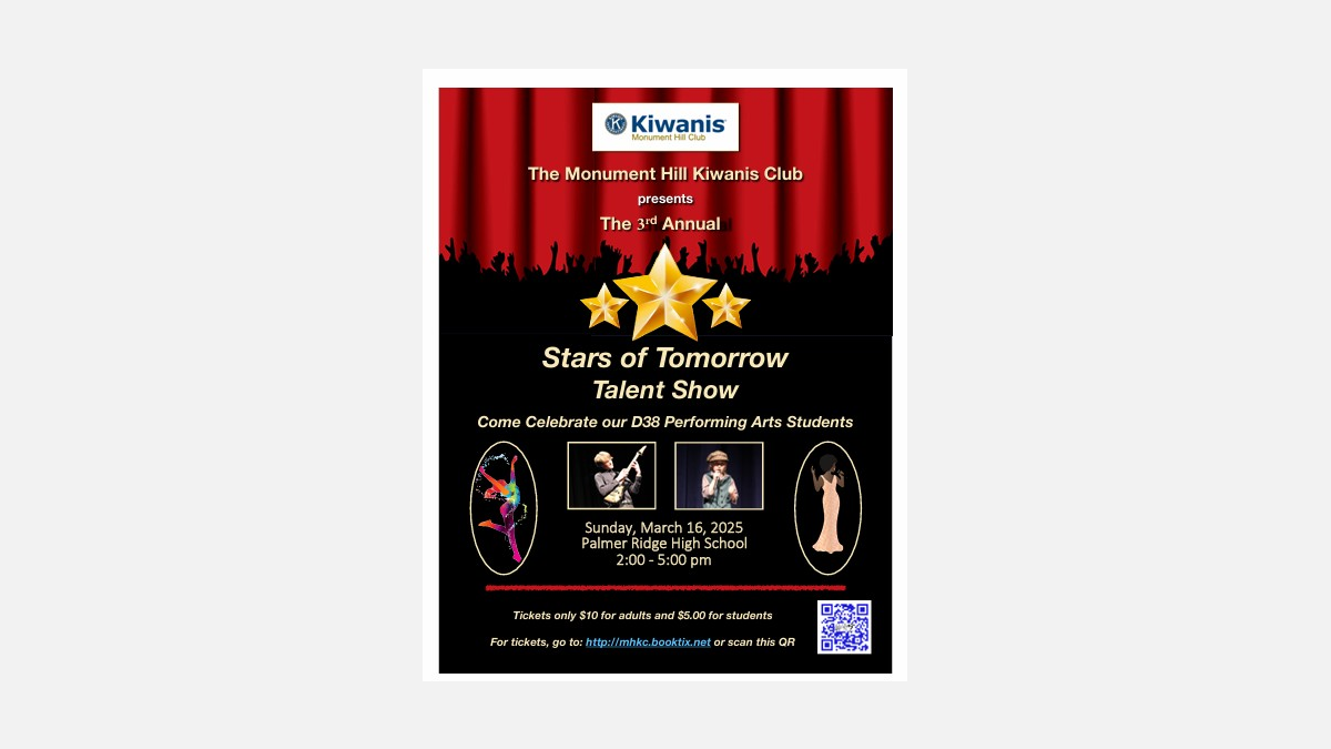 Enjoy an afternoon of performing art by students of Lewis Palmer School District 38. You will be amazed at the breadth and depth of talent of these young people. From elementary through high school level, they shine. You will see singers, musicians, dancers and other acts like comedy. Students will compete for prizes totaling $5,250. A ticket is just $10 for adults and $5 for students. Please join us at Palmer Ridge High School on March 15, 2026 from 2:00 to 5:00 PM. Come, enjoy some great talent and support our budding performing art students.
